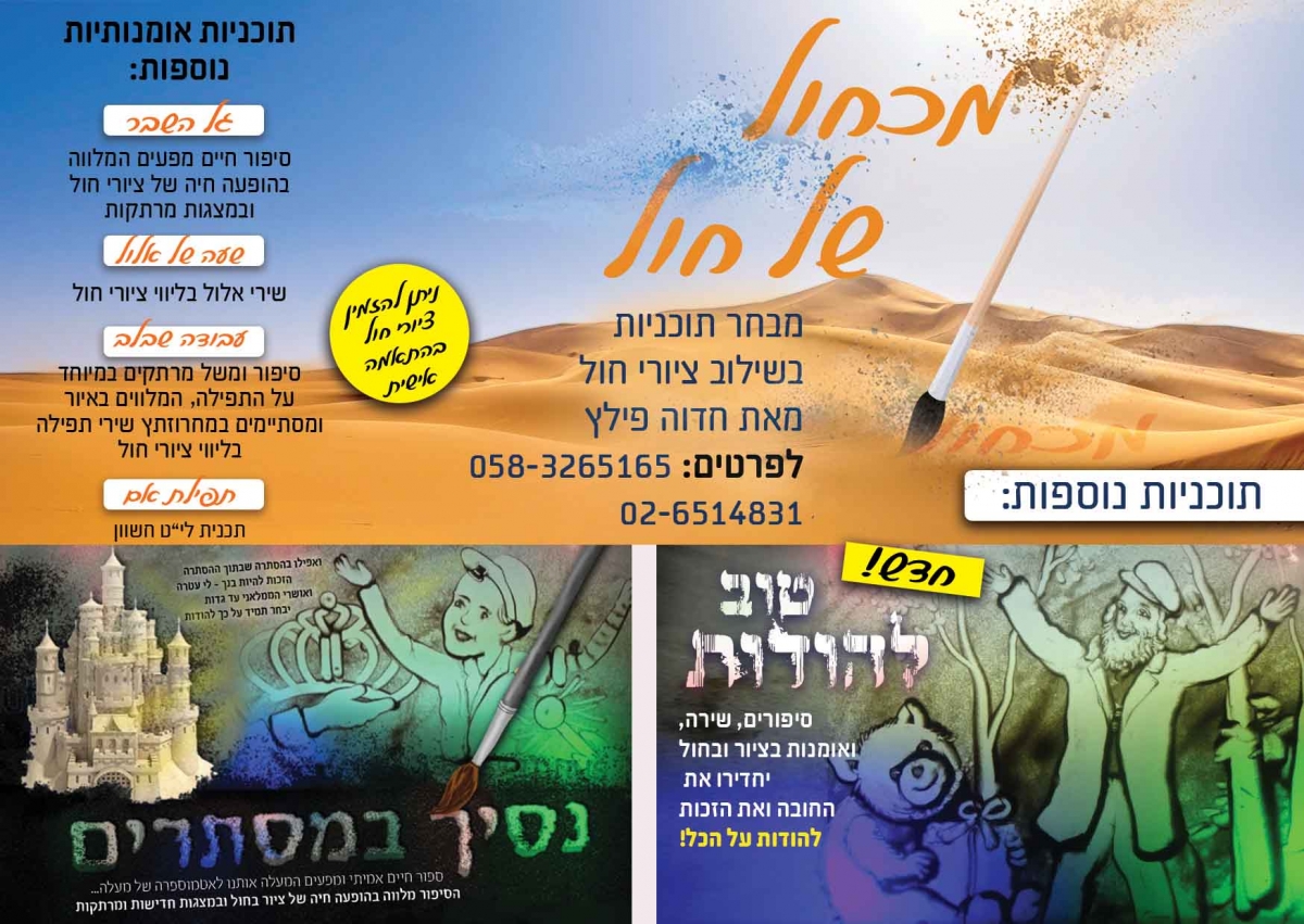 מכחול של חול מבחר תוכניות אומנותיות והשתלבות בכל תוכנית!Tabs פרטי העסק מבחר תוכניות בשילוב ציורי חול מרתקים ומדהימיםמכחול של חול מגוון תוכניות אומנותיות, שילוב אומנות וציור בחול להורדת טריילר התוכנית שעה של ימי הנוראים לחצי כאן להורדת טריילר התוכנית נסיך במסתורין לחצי כאןלהורדת טריילר התוכנית "טוב להודות" לחצי כאן נסיך במסתרים תוכנית מפעימה ומרוממת שהמסר שלה הוא האושר והזכות בהיותנו יהודים גם כשקשה וגם כשצריך לותר בתכנית סיפור מרכזי המלווה בהופעה חיה של ציור בחול וסיפורים נלווים המופיעים במצגות, בין הסיפורים מוסרטים ילדים השרים את השיר "חזו בני" ולסיום שיר עוצמתי ומרגש המלווה במצגת. קהל יעד: התוכנית מתאימה בעיקר לתיכונים ולנשים ואפשר גם לכיתות ז' ח' מכיוון שהרקע של הסיפור הוא השואה. (התוכנית לא טראומית בכלל).אורך התוכנית: כשעה ורבעהתוכנית הוצגה ב: מרכז להשתלמויות ע"י מרכז בית יעקב ירושלים (הסמינר החדש), בבית ספר בנות בויאן, בבית ספר עזרת תורה, חסידי רמות, רמות ג' ועוד. שעה של אלול קריוקי של שירי אלול ותפילה המלווים בהופעה חיה של ציור בחול, ומשובצים בקריינות של קטעי מדרש. קהל יעד: כיתות גבוהות של בתי ספר ותיכוניםאורך: כ40 דקותהתוכנית הוצגה ב: בית ספר בית יעקב תבונות יעקב רמות א' ובתיכון בית חינוך בקרית ספר ובנאות רחל בביתר ועוד. טוב להודות תוכנית המחדירה את החובה והזכות להכיר טובה ולהודות למיטיבים לנו, לבורא עולם, להורים וכדו'. התוכנית מורכבת מסיפור-משל המלווה בציור בשקפים הנעשה במקום, תובנות הנמשל מובעים בשיח ילדות המופיע כהסרטה. הסיפור המרכזי הוא הכרת הטוב הקיימת אצל בעלי חיים, סיפור אמיתי המלווה בהופעה חיה של ציור בחול. התוכנית מלווה בשירים שגם אותם מלווים האיורים בחול, ויש גם הפעלה המחדירה את הצורך להודות על כל דבר. בתוכנית משלוות שירה והפעלה של הבנות קהל יעד: התכנית מתאימה לילדות בכיתות א-ו (מתאים גם למסיבות בת מצוה)אורך התוכנית: כ50 דקותהתוכנית הוצגה ב: בית הספר המרכז ירושלים, ובנאות רחל ביתר עבודה שבלב הסיפור אמיתי - כיצד להגיע לתפילה בכוונה. הסיפור מלווה בציור על שקפים הנעשים במקום והמשכו מחרוזת שירי תפילה המלווים בציור בחול. קיימת תכנית דומה ( בשירים שונים ובתוספת הקראת שיר לתפילת אם, מתאים במיוחד לי"א חשון) קבוצת יעד: כיתות בינוניות וגבוהות ונשיםאורך התוכנית: כשעה ורבעהתוכנית הוצגה ב: מתנ"ס סנהדריה המורחבת, בבית ספר בית יעקב הר נוף, נאות רחל ביתר, ועוד. *קיים תרגום באידיש לתוכנית זו #קיימות תכניות נוספות באידיש. לפרטים: חדוה פילץ 058-3265165 02-6514831 קהל יעד: ילדות יסודילכל המשפחהנערותנשיםנשים ונערותלתשומת לבכם: מופיעים בכל חלקי הארץתוכנית באידישאזור פעילות: מופיעים בכל הארץמבצעים ודילים: ציור בחו"ל בליווי מדרשיםמבצע לחודש אלולספטמבר 2019מחיר מבצע למזמינות עד יז אלול 1200 ש"ח לפני מע"מ לקבוצות קטנות ל50 בנות הנחה נוספת. שתף זאת: לצפיה בוידאו שעה של אלול טריילר.mp4