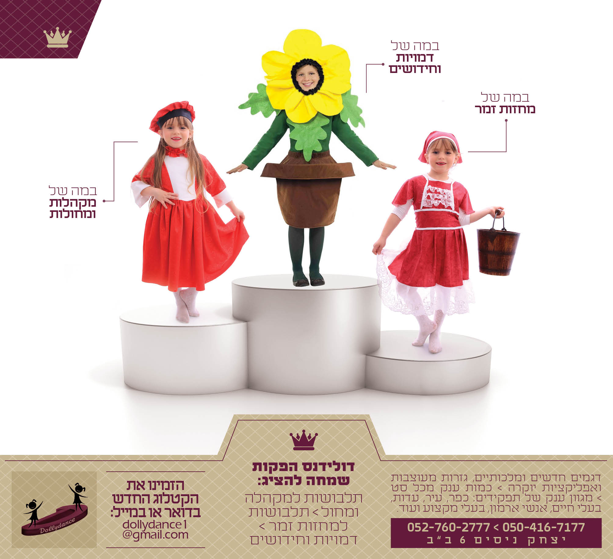 דולידנס הפקות תלבושות אומנות לבמהTabs פרטי העסק תלבושות להפקות במה, מקהלות, מחזות זמר וסרטיםדולידנס הפקות שמחה להציג: השכרת תלבושות איכותיות ואומנותיות, למראה במה מרהיב. ברוכות הבאות לאתר החדש ולקולקציה העדכנית, המתחדשת והמפתיעה. שלחו לנו מייל: dollydance1@gmail.com לרשותכן: תלבושות למקהלות ומחול- מבחר ענק ומרהיב של דגמים, בכמויות ענק ובמודלים מקוריים. תלבושות למחזות זמר- מחלקה עדכנית המלבישה את הבמה בחן ובסטייל. קטגוריות מגוונות וכמות גדולה ממרבית הדגמים. ועכשיו חדש! מחלקת דמויות SUPER PRODUCTION . מבחר דמויות חדש ומרתק שיהפוך את ההפקה שלך לאותנטית ומרהיבה. כעת, אפשר לנוע במנהרת הזמן אל העבר ואפילו אל העתיד. קהל יעד: ילדות יסודיילדיםלכל המשפחהנערותנשים ונערות OK קטלוג 5 דולידנס .pdf OK קטלוג 5 דולידנס .pdf דולידנס 2 קטלוג במשקל מופחת למייל (3).pdf דולידנס 2 קטלוג במשקל מופחת למייל (3).pdf קטלוג 3 דולידנס.pdf קטלוג 3 דולידנס.pdf קטלוג דולידנס 4-.pdf קטלוג דולידנס 4-.pdf קטלוג דולידנס מספר 1 (1).pdf קטלוג דולידנס מספר 1 (1).pdf דולידנס קישורים (1).pdf דולידנס קישורים (1).pdf לתשומת לבכם: מופיעים בכל חלקי הארץמגיעים עם כל הציוד הנדרשאזור פעילות: בכל הארץתלבושות למופעיםמבצעים ודילים: למזמינות תלבושות למחנה קיץלכן המפיקותיוני 2019בהזמנת דגמי מקהלה 200 יחידות תלבושת סופר פרודוקשן לבחירתכן! שתף זאת: