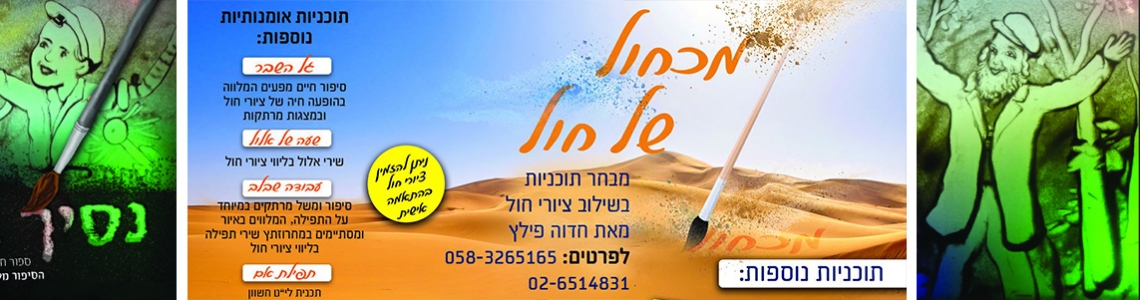 מכחול של חול מבחר תוכניות אומנותיות והשתלבות בכל תוכנית!Tabs פרטי העסק מבחר תוכניות בשילוב ציורי חול מרתקים ומדהימיםמכחול של חול מגוון תוכניות אומנותיות, שילוב אומנות וציור בחול להורדת טריילר התוכנית שעה של ימי הנוראים לחצי כאן להורדת טריילר התוכנית נסיך במסתורין לחצי כאןלהורדת טריילר התוכנית "טוב להודות" לחצי כאן נסיך במסתרים תוכנית מפעימה ומרוממת שהמסר שלה הוא האושר והזכות בהיותנו יהודים גם כשקשה וגם כשצריך לותר בתכנית סיפור מרכזי המלווה בהופעה חיה של ציור בחול וסיפורים נלווים המופיעים במצגות, בין הסיפורים מוסרטים ילדים השרים את השיר "חזו בני" ולסיום שיר עוצמתי ומרגש המלווה במצגת. קהל יעד: התוכנית מתאימה בעיקר לתיכונים ולנשים ואפשר גם לכיתות ז' ח' מכיוון שהרקע של הסיפור הוא השואה. (התוכנית לא טראומית בכלל).אורך התוכנית: כשעה ורבעהתוכנית הוצגה ב: מרכז להשתלמויות ע"י מרכז בית יעקב ירושלים (הסמינר החדש), בבית ספר בנות בויאן, בבית ספר עזרת תורה, חסידי רמות, רמות ג' ועוד. שעה של אלול קריוקי של שירי אלול ותפילה המלווים בהופעה חיה של ציור בחול, ומשובצים בקריינות של קטעי מדרש. קהל יעד: כיתות גבוהות של בתי ספר ותיכוניםאורך: כ40 דקותהתוכנית הוצגה ב: בית ספר בית יעקב תבונות יעקב רמות א' ובתיכון בית חינוך בקרית ספר ובנאות רחל בביתר ועוד. טוב להודות תוכנית המחדירה את החובה והזכות להכיר טובה ולהודות למיטיבים לנו, לבורא עולם, להורים וכדו'. התוכנית מורכבת מסיפור-משל המלווה בציור בשקפים הנעשה במקום, תובנות הנמשל מובעים בשיח ילדות המופיע כהסרטה. הסיפור המרכזי הוא הכרת הטוב הקיימת אצל בעלי חיים, סיפור אמיתי המלווה בהופעה חיה של ציור בחול. התוכנית מלווה בשירים שגם אותם מלווים האיורים בחול, ויש גם הפעלה המחדירה את הצורך להודות על כל דבר. בתוכנית משלוות שירה והפעלה של הבנות קהל יעד: התכנית מתאימה לילדות בכיתות א-ו (מתאים גם למסיבות בת מצוה)אורך התוכנית: כ50 דקותהתוכנית הוצגה ב: בית הספר המרכז ירושלים, ובנאות רחל ביתר עבודה שבלב הסיפור אמיתי - כיצד להגיע לתפילה בכוונה. הסיפור מלווה בציור על שקפים הנעשים במקום והמשכו מחרוזת שירי תפילה המלווים בציור בחול. קיימת תכנית דומה ( בשירים שונים ובתוספת הקראת שיר לתפילת אם, מתאים במיוחד לי"א חשון) קבוצת יעד: כיתות בינוניות וגבוהות ונשיםאורך התוכנית: כשעה ורבעהתוכנית הוצגה ב: מתנ"ס סנהדריה המורחבת, בבית ספר בית יעקב הר נוף, נאות רחל ביתר, ועוד. *קיים תרגום באידיש לתוכנית זו #קיימות תכניות נוספות באידיש. לפרטים: חדוה פילץ 058-3265165 02-6514831 קהל יעד: ילדות יסודילכל המשפחהנערותנשיםנשים ונערותלתשומת לבכם: מופיעים בכל חלקי הארץתוכנית באידישאזור פעילות: מופיעים בכל הארץמבצעים ודילים: ציור בחו"ל בליווי מדרשיםמבצע לחודש אלולספטמבר 2019מחיר מבצע למזמינות עד יז אלול 1200 ש"ח לפני מע"מ לקבוצות קטנות ל50 בנות הנחה נוספת. שתף זאת: לצפיה בוידאו שעה של אלול טריילר.mp4